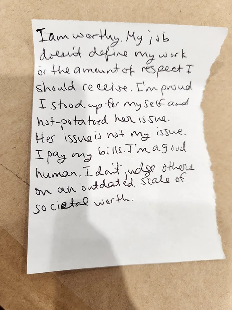 “I am worthy. My job doesn’t define my work or the amount of respect I should receive. I’m proud I stood up for myself and hot-potatoed her issue. Her issue is not my issue. I pay my bills. I’m a good human. I don’t judge others on an outdated scale of societal worth.” Then I took a picture of the paper so I could have it as a reference and potentially to show my therapist so she could be proud.